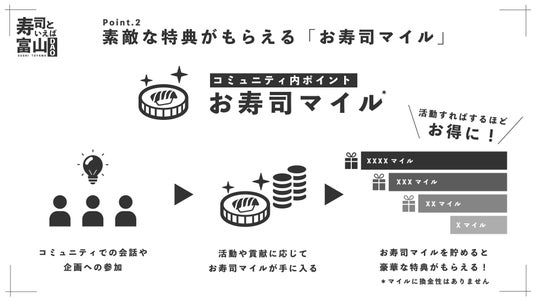 また、コミュニティでの活動や貢献に応じて、「お寿司マイル」というコミュニティ内ポイントを貯めることができます。「お寿司マイル」を貯めると、提携寿司店で使えるお食事券や富山県の特産品など様々な特典と交換できます。コミュニティでの活動を楽しみながら、お得に特典もゲットすることが可能です。