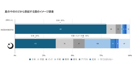 1914年に長野県・軽井沢に開業した星野温泉旅館を源流として、現在国内6施設、海外2施設を展開する「星のや」。日本発のグローバルホテルブランドとして、海外の人々がブランドロゴに抱くイメージ調査を実施しました。「以下のロゴをご覧になり、ロゴから連想される国名に最も当てはまるものをそれぞれお答えください。」という設問に対して、ローマ字の「HOSHINOYA」は約80%が日本的と回答しました。一方で、従来のシンボルマークである月星紋(つきほしもん)は、日本以外では、中東の印象を持つ方が最も多く、次いで中国・インドと、3地域の印象が回答のおおよそ半数となり、日本以外の国の印象も多く持たれていることが分かりました。本調査結果を踏まえ、日本のホテルオペレーターとして更なる進化を続けるために、ブランドロゴをリニューアルしました。