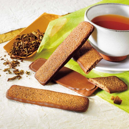 京都府産宇治ほうじ茶が香るミルクチョコレートを、京都府産宇治ほうじ茶を入れたクッキーの片面にコーティングしました。クッキーにはコク深いタイプと香ばしいタイプの2種類のほうじ茶を使い、力強いほうじ茶感が味わえるようにしました。クッキーの隠し味にプラスしたオレンジゼスト(※)とバナナパウダーがほうじ茶の香りとコクをより一層引き立てます。