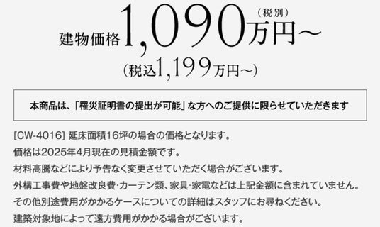 被災者の住み替えをスムーズに実現するため、規格化設計による効率化でコストパフォーマンスの向上と工期の短縮を実現。建築価格1,048万円~(税込1,153万円)で提供しています。低コストでありながら高性能であり、多くの方々が安心して暮らせる住まいとなっています。