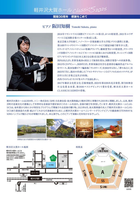 軽井沢大賀ホールは2004年、ソニー株式会社(当時)元名誉会長・故 大賀典雄より軽井沢町に寄贈され2005年に開館しました。以来、軽井沢町の音楽文化の要衝として世界的な音楽家や愛好家がこのホールを訪れ、音楽の歓びを享受しています。軽井沢大賀ホール CLASSICSは、大賀氏の遺志を受け継いだ夫人の大賀 緑を実行委員長に擁して毎年夏から秋にかけ特別なプログラムで開催される音楽の贈り物。2025年は、研ぎ澄まされた技巧と感性で名だたる愛好家、評論家をも唸らせるピアニスト阪田知樹が登場。”ピアノの魔術師”フランツ・リストの大作『ロ短調ソナタ』をメインに、この会場でしか聴けない特別なプログラムをお届けします。