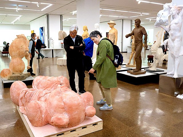 午前10時の開場から家族連れらが続々と訪れ、じっくりと作品を鑑賞。戦争や自然災害など時代を反映した絵画や、若い感性あふれる抽象作品にも関心が集まった。展示作は一部を除いて写真撮影でき、カメラを向け楽しむ姿も見られた。