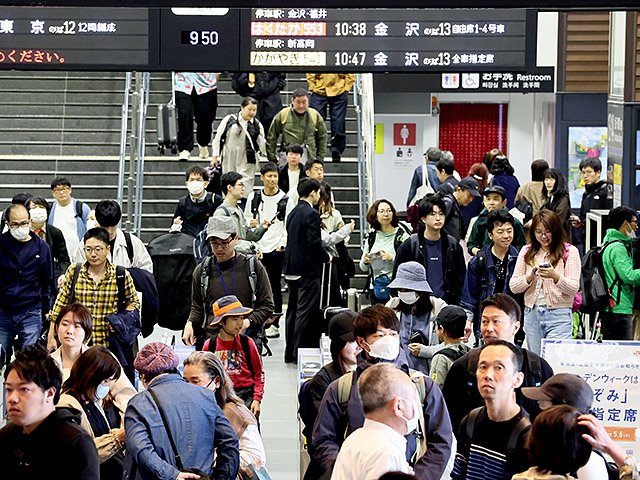 JR西日本金沢支社によると、東京発金沢、敦賀行きの「かがやき」「はくたか」の指定席はこの日、午前6時時点で計32本中15本が満席となった。午後4時までの自由席乗車率は最高90%だった。東京方面から北陸への入り込みのピークは5月3日、Uターンは同5日と見込んでいる。