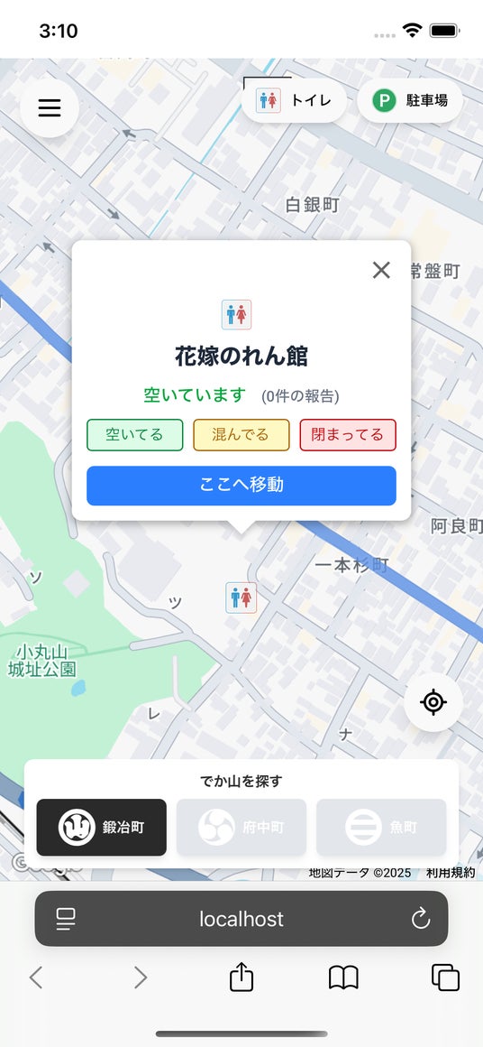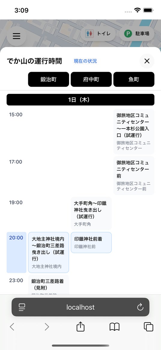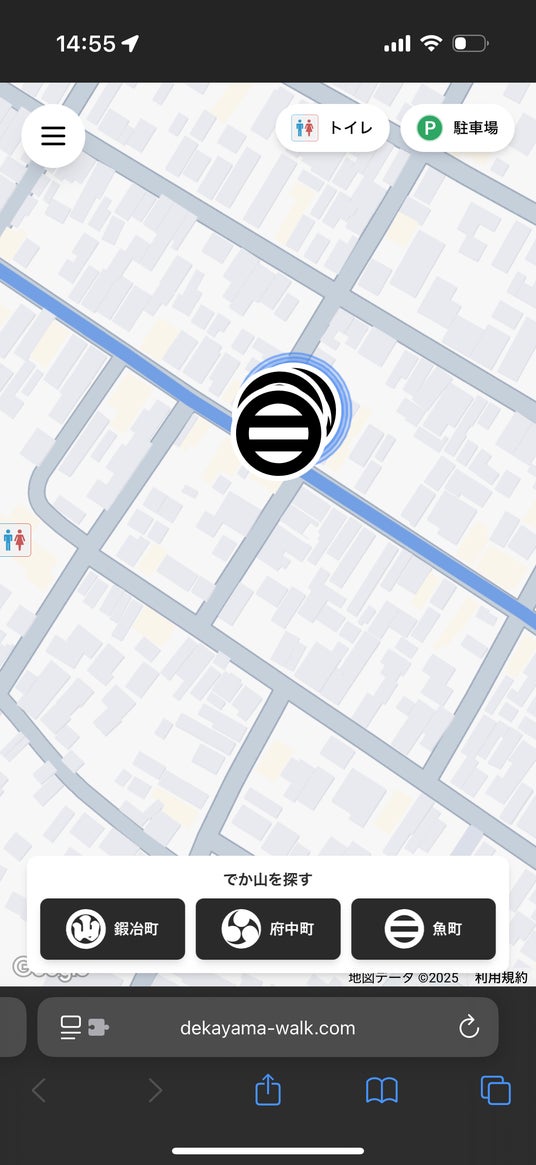 GPS連携により、各曳山の現在地をマップ上に表示。混雑する市街地でも正確に追跡できます。