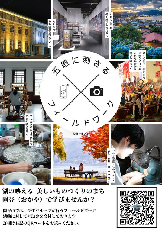 岡谷市では、新たに大学生等フィールドワーク推進事業補助金を創設しました。県外の大学生等のゼミや研究室等のグループが、岡谷市内でフィールドワーク活動を行う際の交通費・宿泊費などの一部を補助いたします。