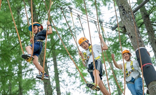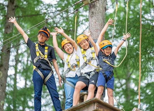 空中アスレチックは、自然の中で活動し、遊びと冒険を通して学びを得る絶好の場です。勇気を出して挑戦したり、助け合い協力しながらゴールに到達したりすることで、自尊心の向上、相互援助の精神の育成、一体感や達成感の獲得が期待できます。