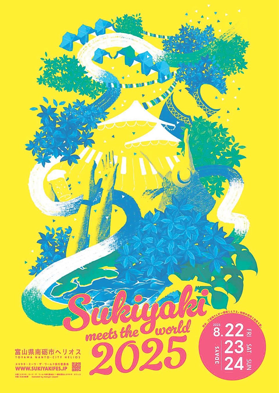 富山県南砺市福野地域で8月22~24日に開かれるワールドミュージックの祭典「スキヤキ・ミーツ・ザ・ワールド2025」の出演アーティスト第1弾と、ポスターやチラシに用いるイメージイラストが決まった。今回は国境やジャンルを超えた新たな音楽表現に挑む6組が、福野の夏を彩る。