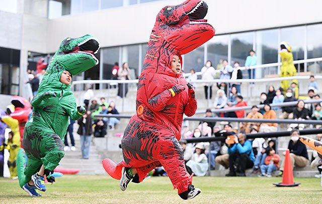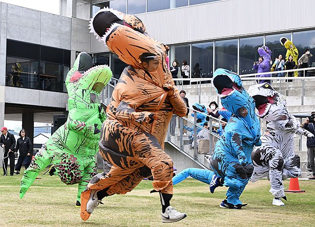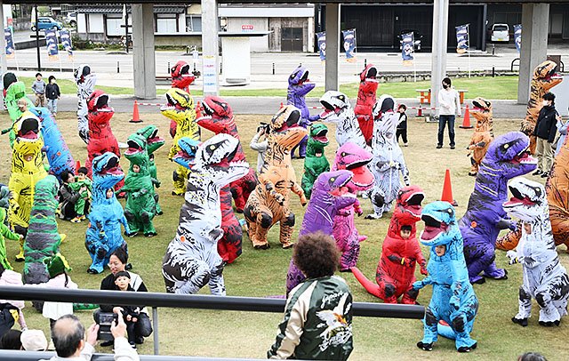 「超ティラノサウルスレースin氷見」が29日、富山県の氷見市芸術文化館の青空広場で行われた。出場者がカラフルな恐竜の着ぐるみで力走し、会場を盛り上げた。