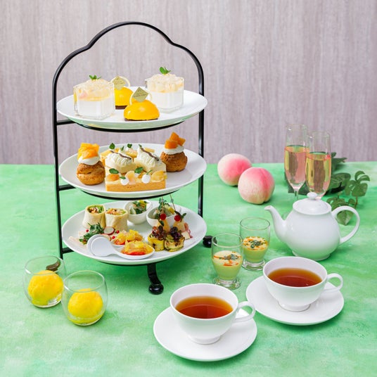 季節毎に旬の素材をテーマに、ホテル金沢の山岸パティシエが手がける繊細で華やかなスイーツを堪能できるアフタヌーンティー。今回のテーマは、「桃」と「マンゴー」です。みずみずしく豊饒な美味を誇る桃と、甘さ弾ける夏の果実の代名詞マンゴーをふんだんに使用したスイーツ、そして洋食シェフ陣のアイデアが光る旬の食材を使用したセイボリーをご用意いたしました。