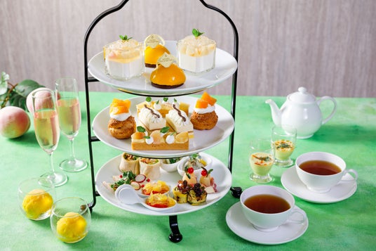 セイボリーには洋食シェフ陣によるオリジナリティ溢れるフィンガーフードをご用意。チーズと生ハムの塩味と桃のフルーティな甘さが絶妙に絡み合う「カマンベールチーズと生ハム巻き 桃のピンチョス」や、さっぱりした白身のスズキを大葉の爽やかな風味と甘酸っぱい桃のドレッシングで仕上げた「スズキのマリネと大葉のピーチヴィネグレット」のほか、「グリルズッキーニとハーブチーズロール ドライフルーツのサルサ」や「鶏ハムのスライス レフォールクリームとマンゴーソース」など、紅茶だけでなくついついお酒が進んでしまいそうなラインナップ。スパークリングワインをフリーフローでお楽しみいただけるプランもご用意しております。(※別途追加料金あり)