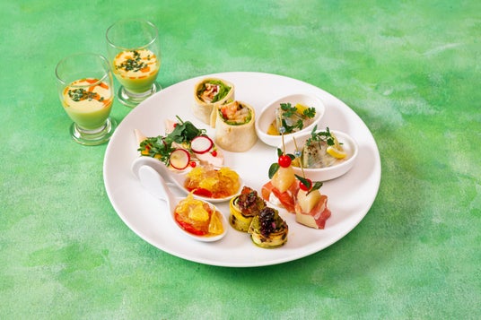カマンベールチーズと生ハム巻き 桃のピンチョス、スズキのマリネと大葉のピーチヴィネグレット、ドライトマトと甘夏のコンポートゼリー、グリルズッキーニとハーブチーズロール ドライフルーツのサルサ、鶏ハムのスライス レフォールクリームとマンゴーソース、タコと野菜のピリ辛トルティーヤ巻き