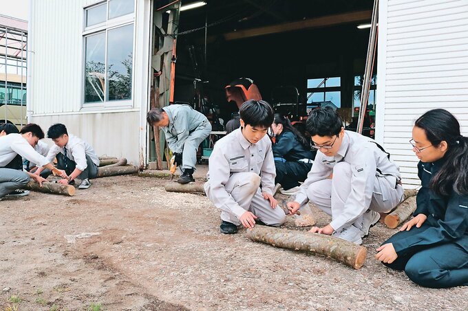 40年ほど前からある中庭のケヤキの剪定で大量の太い枝が出たことから、何かに利用できないかとプロジェクトを企画。2025年度に同好会から部活動に格上げされた同校グリーン部の生徒たちが中心となって取り組む。