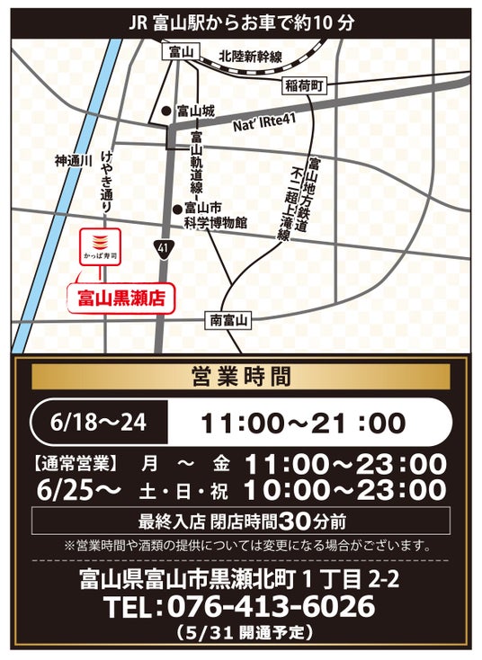 コロワイドグループのかっぱ寿司(カッパ・クリエイト(株) 本社:神奈川県横浜市、代表取締役社長:山角豪)は、2025年6月18日(水)《予定》 に『かっぱ寿司 富山黒瀬店』をオープンいたします。