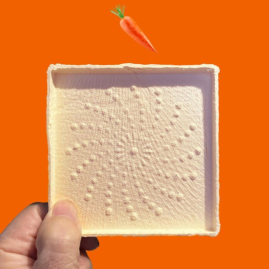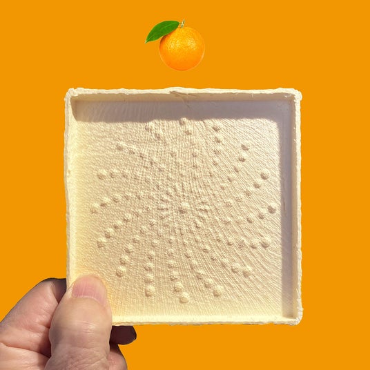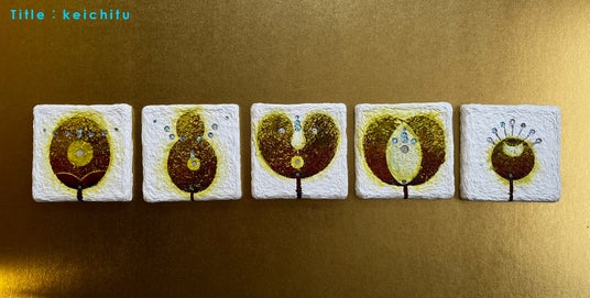 特殊な加工で成形した和紙素材はスクラッチ(引っかき傷)や象嵌(埋め込み)などの多彩多様なストレスの掛かる画法に耐えるキャンバスのような堅牢さとテクスチャーがあります。この堅牢さを利用してコースター裏面にスクラッチや象嵌などのミクストメディアを使ったアート作品を製作しました。