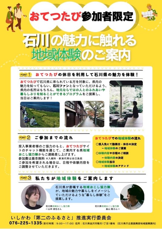 また、現地では「石川県地域おこし協力隊」の隊員が地域での交流や体験活動をサポート。参加者はおてつたびを通して地域の魅力に触れることができます。 地域を深く知る隊員だからこそ、県内の名所はもちろん、地元ならではのディープな人とのふれあいや暮らしぶりを知れるプログラムをご提案予定です 。