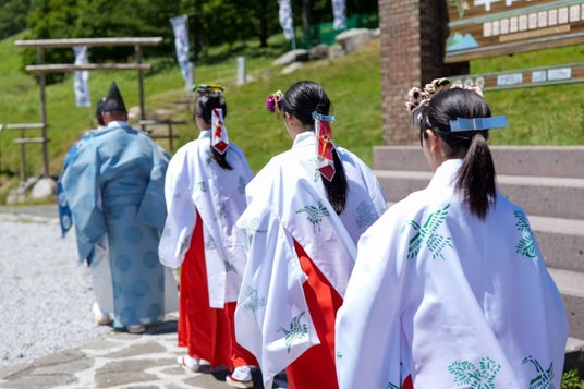 厳粛な神事: 車山神社の神職と巫女による、全国の山々の平安、登山者の安全、海の豊穣を祈る神聖な儀式。縄文時代から続く祈りの伝統を体感できます。感謝と安全の奉納: 山と海の恵みを象徴する供物や、登山者の安全を願う祈祷札を神前に奉納。
