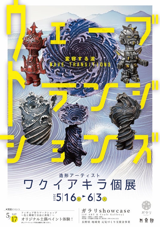 今回、コラボレーション作品として、小布施町にゆかりのある葛飾北斎の代表作『上町祭屋台天井絵 怒濤図』をオマージュした土偶・火焔土器などの陶芸作品を制作いただきました。また、ワクイ氏を講師に迎え、子供から大人まで陶芸やアートを身近に感じるワークショップも開催されます。