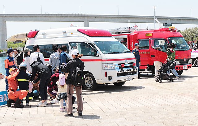 ミニ遊園地には子ども用の小さな車や、飛び跳ねて遊べる「ふわふわドーム」が並んだ。消防車やパトカーといった車両の展示やキッチンカーの出店、フリーマーケットもあった。
