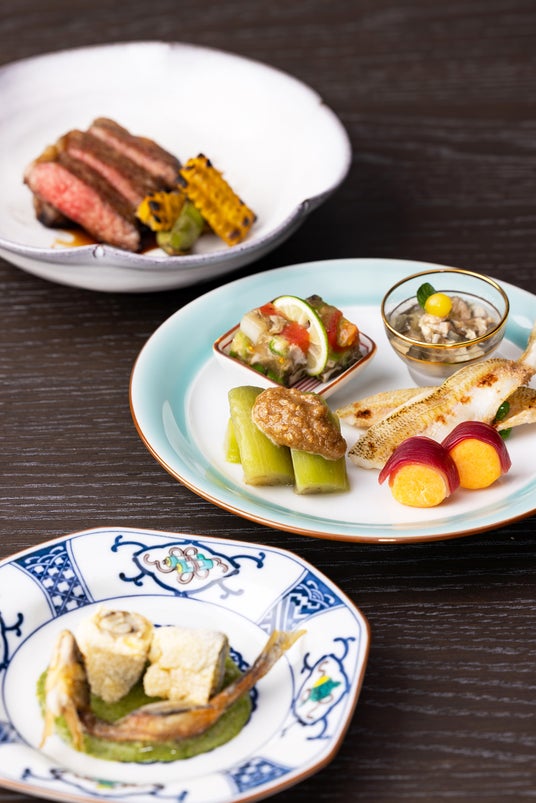 軽井沢発祥の信州味噌・醤油・豆を使った、シンプルで飽きのこない和食を提供する食処「酢重」が創るオーベルジュスタイルのホテル「HOTEL AO KANAZAWA」では、旬のものや地で獲れる新鮮な食材を使用したディナーコース付きの宿泊プランを季節に応じてご用意しております。6月1日(日)から提供するディナーは「北陸の夏コース」。見た目も涼やかな前菜から始まる一皿は、すっぽんをコンソメスープに仕立てた一品や、翡翠色が鮮やかな瑞々しい茄子にコクのある胡麻ソースを掛けた前菜5品が並びます。北陸の海の幸は「福井ぐじ」を使ったお椀、「なめら」や「甘エビ」などの新鮮なお造り盛り合わせ、「北陸鮎」をカリッと仕上げた揚げ物をご用意。山里の幸は、希少なブランド牛「能登牛」を薫り高い藁焼きで。オリジナルの銅釜で炊き上げる「酢重」自慢の白米は、「鰻丼」でご提供します。炭火で焼き上げる鰻は表面のカリッとした食感とふわふわの身の質感をお楽しみください。栄養豊富なすっぽん、能登牛に鰻、夏の風物詩ともいえる食材をコース料理で味わう「北陸の夏コース」。