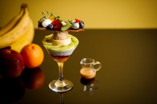 果実とプリンのパフェ 【期間限定】 ¥1,500(税込)宙に浮かぶようなパイとフルーツが目を引く、遊び心あふれるプリンパフェ。ザクザク食感のキャラメリゼパイの上には彩り豊かなフルーツとクリームを、グラスにはプリンやキャラメルセミフレッド、アールグレイゼリーを重ね、味・香り・食感の変化を楽しめます。 別添ソースでほろ苦さをプラスして大人の味わいに。