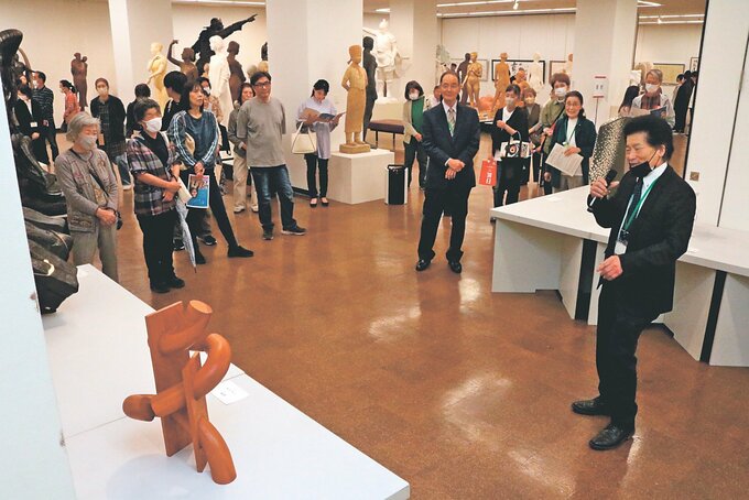 幅広い年代が会場を訪れ、作家による解説に耳を傾けたり、作品をじっくりと眺めたりした。高岡龍谷高校美術部の川本浩太さん(3年)は、男性2人を題材にした桑山賀行(くわやまがこう)さん(神奈川)の彫刻「たそがれの中で…」が気に入った。「2人の対比が面白い。いろいろな作品が見られて、来て良かった」と話した。