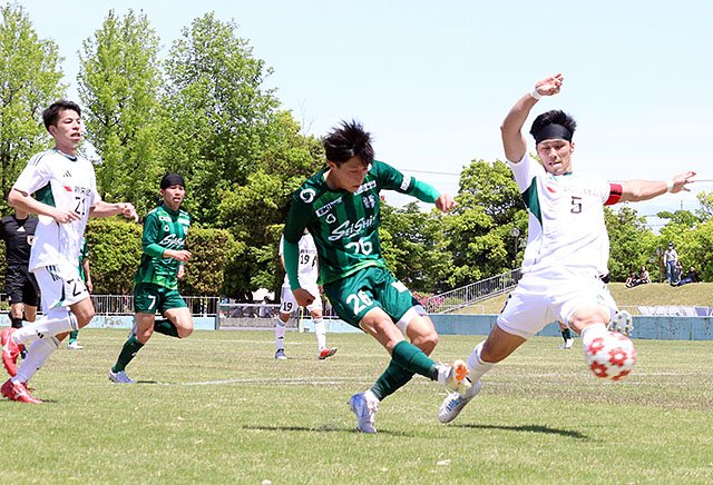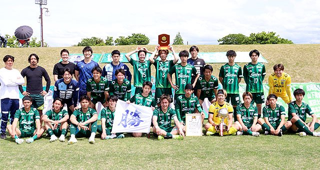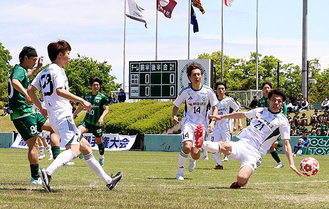 富山新庄クは攻撃陣が爆発し、7得点で圧倒した。前半1分にMF飯島が「狙っていた」という左クロスに反応して先制。その後、攻めながらもネットを揺らせない時間が続いたが、36分にFW森本が豪快なシュートを決め、2-0で折り返した。