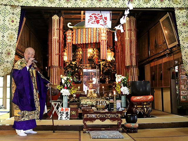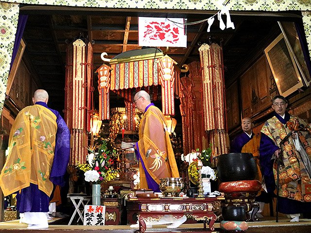 この日は本尊宮殿の扉を開く開創1300年開扉法要のほか、本尊へ新住職の就任を報告した晋山奉告法要、弘法大師の誕生を祝う大師降誕会法要などを実施。前住職の青山哲澄(てっちょう)さん(77)らとともに特別三法要を取り仕切った青山泰司(たいじ)住職(46)は「多くの方に支えられていると実感した。無事に終えてホッとしている。重責だと思うが、地域のためにという気持ちでやりたい」と真剣な表情で話した。