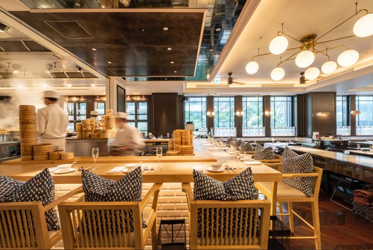 アラン・ヤウ氏の日本初店舗としてオープンした「YAUMAY」は、2018年11月に誕生した丸の内の新ランドマーク「二重橋スクエア」2階に店を構えています。広々としたメインフロアにはライブ感あふれるオープンキッチンを設けており、客席との一体感が魅力。厨房では熟練の点心師が、蒸籠(せいろ)から立ちのぼる湯気の向こうで、一つひとつ丁寧に点心を包み上げる様子をご覧いただけます。