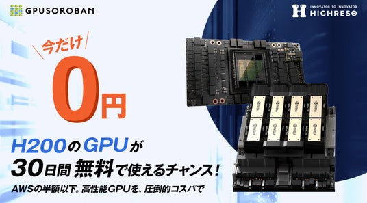 GPUクラウドサービス「GPUSOROBAN」を展開する株式会社ハイレゾ(本社:東京都新宿区、代表取締役:志倉喜幸、以下当社)は、AI基盤モデルの開発に欠かせないNVIDIA H200を搭載したGPUクラウドサービス「AIスパコンクラウド」の30日間無料トライアルを開始しました。
