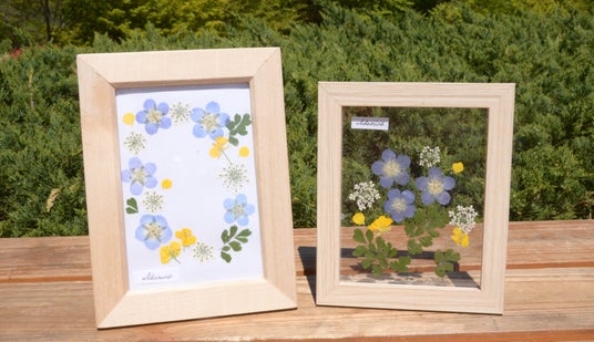 花畑のネモフィラを使った押し花フレームづくり。「れき原の花畑」に咲くネモフィラや園内の草花を約1週間乾燥させた押し花をご用意。フォトフレームは、絵画のような印象の台紙付きのものと、 花が浮かびあがるように空間に映える背板が透明なもののどちらかをお選びいただけます。