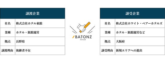 M&A・事業承継支援プラットフォーム「BATONZ(バトンズ)」を運営する株式会社バトンズ(本社:東京都中央区、代表取締役CEO:神瀬悠一、以下バトンズ)は、長野信用金庫(本店:長野県長野市、理事長:市川公一 )とともに、株式会社ホワイト・ベアーホテルズ(本社:大阪府大阪市、以下ホワイト・ベアーホテルズ)と株式会社ホテル東館(本社:長野県下高井郡山ノ内町、以下ホテル東館)のM&A成約を支援したことをお知らせします。