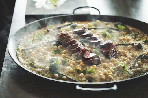 地元で狩猟した鹿肉と大豆のパエリア