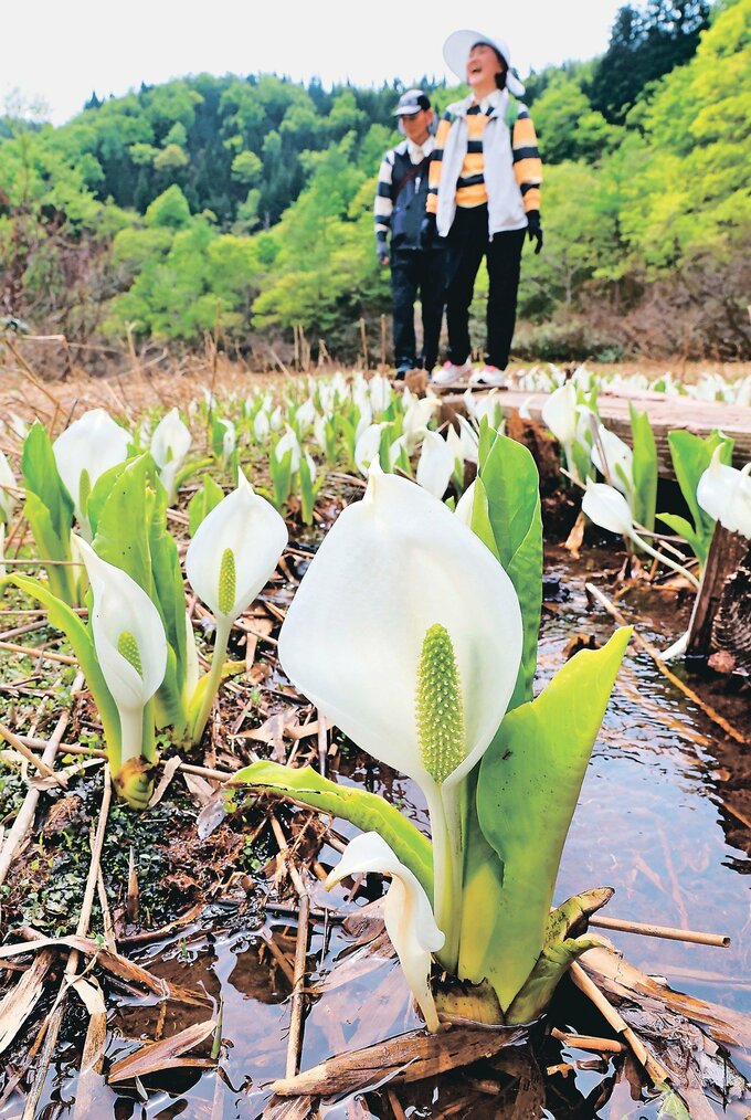 南砺市城端地域の縄ケ池ではミズバショウが見頃を迎え、訪れた人が湿地帯に広がる真っ白い仏炎苞(ぶつえんほう)を楽しんでいた。