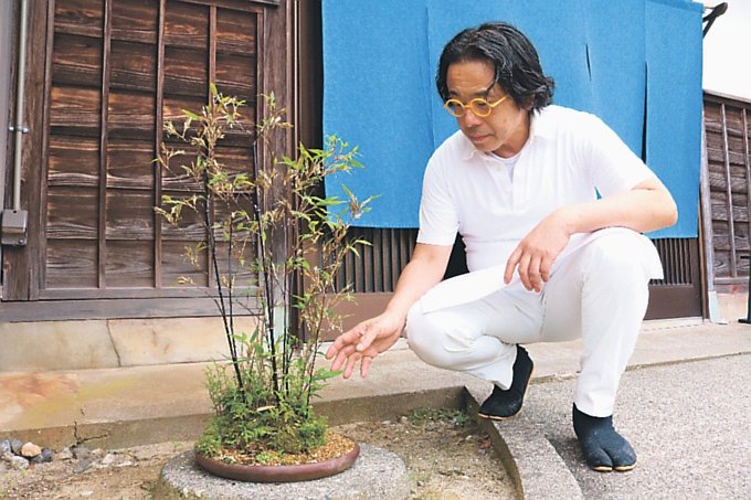 2年前に開店した際に、知り合いから盆栽として贈られた。花は小麦のような色と形で、中島克己店主(55)は「最初は花と思わなかった」と驚く。