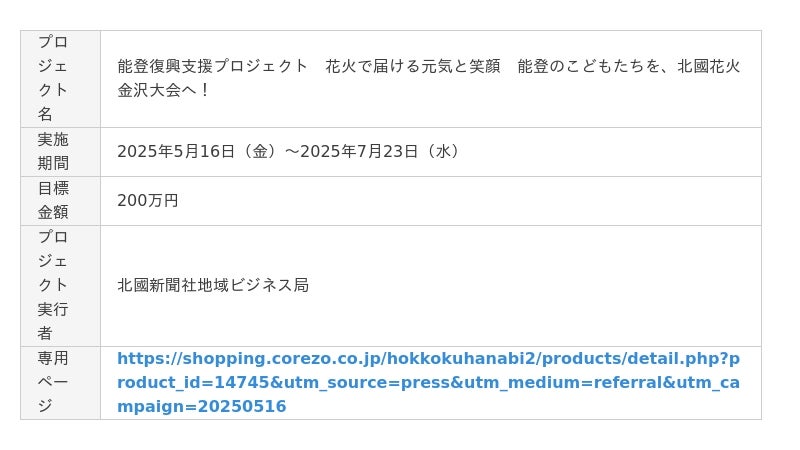 株式会社北國フィナンシャルホールディングス(代表取締役社長:杖村 修司)グループの株式会社COREZO(代表取締役社長:園 悟志)は自社が運営するクラウドファンディングサイト「COREZO FAMILY FUNDING」にて、新プロジェクト「能登復興支援プロジェクト 花火で届ける元気と笑顔 能登のこどもたちを、北國花火金沢大会へ!」を公開しましたのでお知らせします。