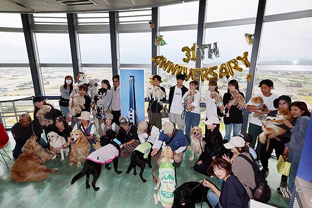 タワー搭乗は午前9時と午後4時からの各1時間、事前予約した各15組を対象に行われた。午前は愛犬家と18匹が高さ100メートルの展望フロアに上がり、一緒に眺めを楽しんだり交流したりして過ごした。富山市長附からゴールデンレトリバーのゴル君と訪れた北村里奈さん(33)は「こういうイベントがなかなかなく、うれしい」とにっこり。立山町利田からポメラニアンのまる君とリク君と初めて訪れた中川裕さん(53)は「人にも犬など生き物にも優しい社会になれば」と話した。