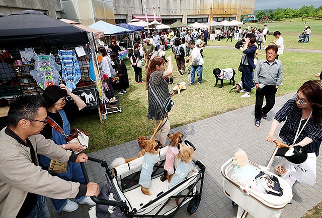 キッチンカーフェスには飲食の14台が出店し、犬グッズなどを扱う14店参加のマルシェも開かれた。普段は犬を連れての立ち入りを遠慮してもらっているという円形の芝生広場が半分開放され、思い思いに楽しむ姿が見られた。散歩のマナーを学びながら周辺を歩く「パックウオーク」があったほか、悩み相談や爪などのお手入れコーナーも設けられた。