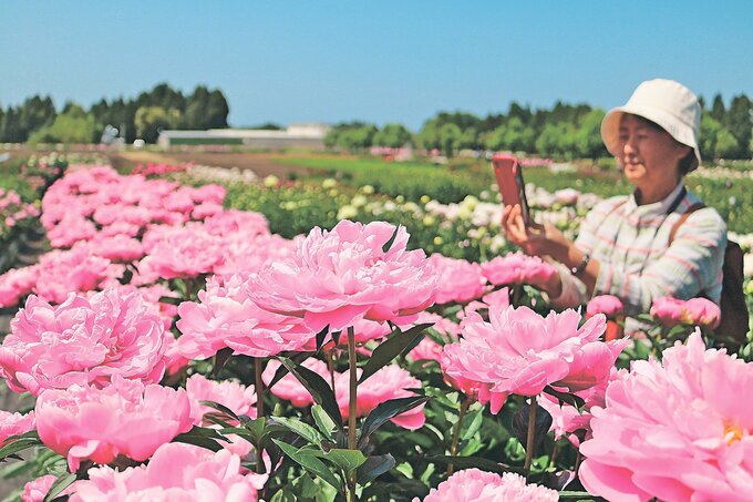 同センターはシャクヤクなど薬用植物の栽培普及指導や農家への種苗販売を行っており、シャクヤク園には約250品種、約3000株を植栽。薬草に親しんでもらおうと一般開放している。初めて訪れたという富山市上冨居の北野真澄さん(90)は「(シャクヤク園の)広さと品種の多さに驚いた」と話した。