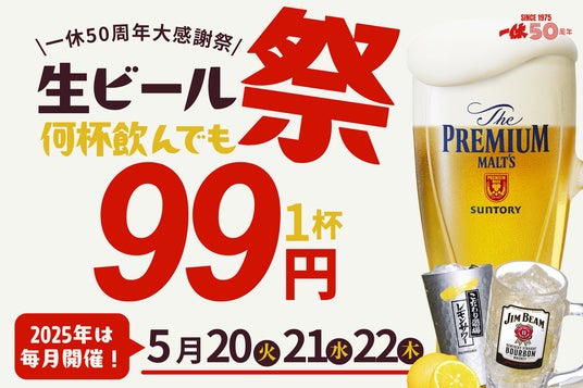 居酒屋一休では、5月20日(火)~22日(木)限定で「生ビール99円祭り」を開催いたします!