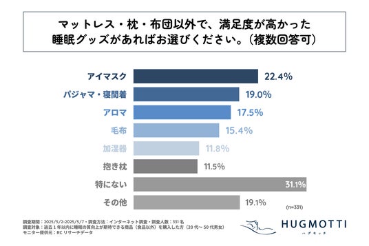 次に、「マットレス・枕・布団以外で、満足度が高かった睡眠グッズ」を尋ねる設問の回答では、1位が「特にない」で31.1%、2位が「アイマスク」で22.4%、3位が「パジャマ・寝間着」で19.0%という結果になりました。この結果から、マットレス・枕・布団といった寝具以外で比較的満足度が高い睡眠グッズは、アイマスクやパジャマ・寝間着であることがわかりました。