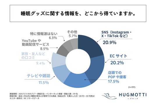 調査の最後、「睡眠グッズに関する情報を、どこから得ているか」を尋ねる設問の回答では、1位が「SNS(Instagram・X・TikTokなど)」で20.9%、2位が「ECサイト」で20.2%、3位が「店頭でのPOPや接客」で17.5%という結果になりました。この結果から、睡眠グッズに関する情報は主に「SNS(Instagram・X・TikTokなど)」や「ECサイト」から得ている人が多いことがわかりました。
