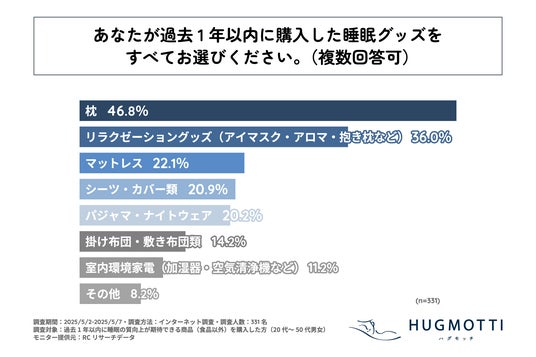 まず、「過去1年以内に購入した睡眠グッズ」を尋ねる設問への回答では、1位が「枕」で46.8%、2位が「リラクゼーショングッズ(アイマスク・アロマ・抱き枕など)」で36.0%、3位が「マットレス」で22.1%という結果になりました。また、4位以降も回答率20%を超える回答が複数並ぶ形となり、この結果から、過去1年以内に購入された睡眠グッズは様々あることがわかりました。