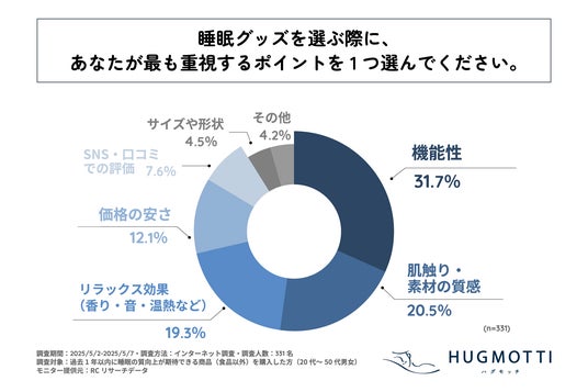 また、「睡眠グッズを選ぶ際に、最も重視するポイント」を選んでもらう設問の回答では、1位が「機能性」で31.7%、2位が「肌触り・素材の質感」で20.5%、3位が「リラックス効果(香り・音・温熱など)」で19.3%という結果になりました。この結果から、多くの人が睡眠グッズを選ぶ際に、最も重視するポイントは「機能性」であることが明らかになりました。
