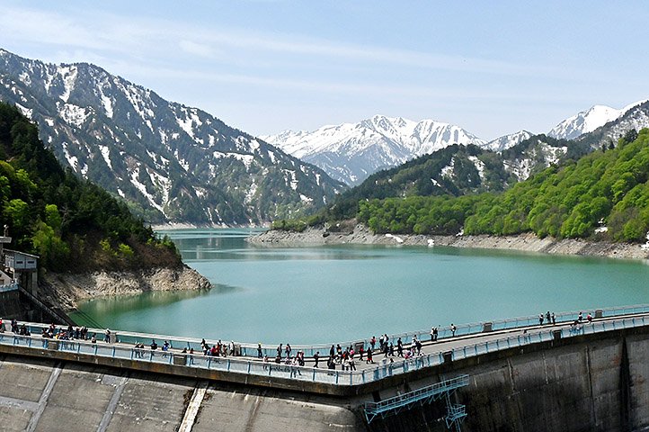 ディスプレーは、レストハウス3階の無料休憩所に設置。縦2メートル、横3・6メートルで、55インチの画面を9台つなげた。ドローンで四季折々の黒部ダムを撮影し、6分間の映像にまとめた。放映は雨や霧、雨量規制で観光放水が見られないときなどに限る。黒部ダム駅の所員が天候を判断し、同駅とレストハウスの看板、長野県の扇沢駅のモニターで放映を案内する。