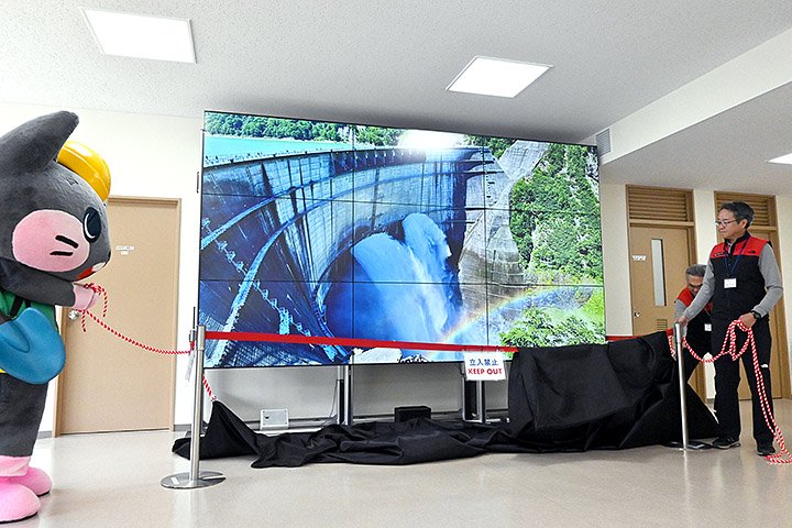 21日は、黒四管理事務所の西田章一郎所長と黒部ダムのマスコットキャラクター「くろにょん」らがディスプレーをお披露目。西田所長は「少しでも景色を楽しんでいただき、満足度が上がればうれしい」と話した。今後は映像の種類を増やす予定という。