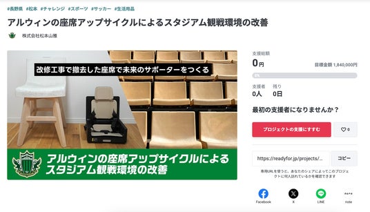 株式会社松本山雅(所在地:長野県松本市)は、5月26日(月)よりホームスタジアム「サンプロ アルウィン」の座席改修工事で撤去された旧座席に脚を取り付けてアップサイクルした椅子の製作により支援者を募り、小さな子どもたちの観戦をサポートするポータブルチェアを購入することで、スタジアム観戦環境の改善を目指す、クラウドファンディングに挑戦いたします。