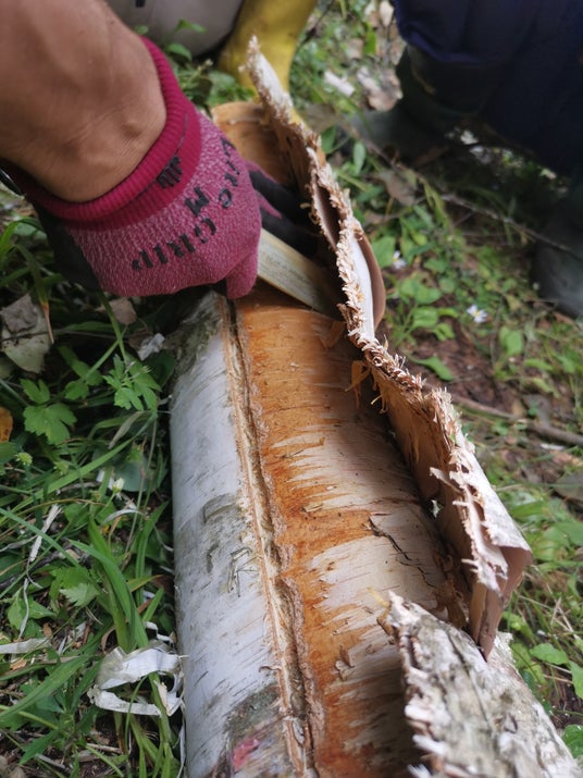 白樺の樹皮をむく