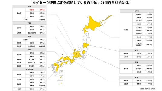 当社はこれまで21道府県・38自治体と連携協定を締結しており、今回の射水市との連携は、21道府県・39自治体目となります(※3)。また、富山県内においては、南砺市、魚津市に続き、3事例目となります。