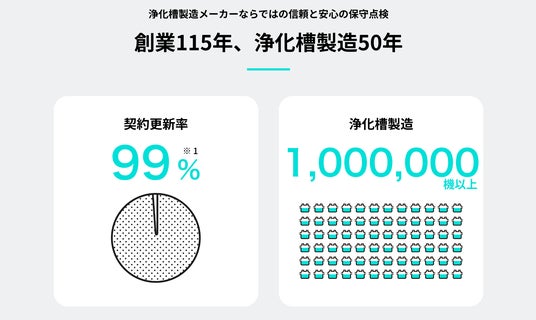 当社は、浄化槽の開発・製造・販売・施工・維持管理に至るまで一貫して行う業界唯一の企業※として、お客さまに最適なサービスをご提供いたします。このサービスを通じて、お客さまがスムーズに保守点検を依頼できるだけでなく、浄化槽や水環境について関心を持つきっかけとなることを目指しています。