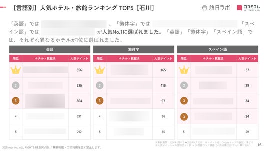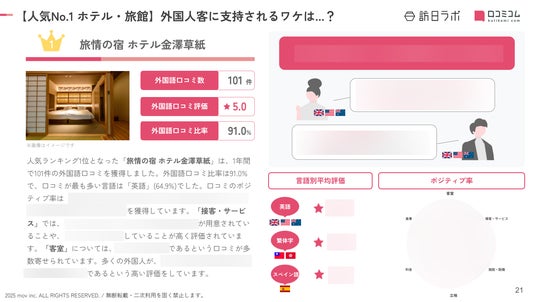 業界最大級のインバウンドビジネスメディア「訪日ラボ」及び 店舗向け集客一元化プラットフォーム「口コミコム」を運営する株式会社mov(代表取締役:渡邊 誠、本社:東京都渋谷区、以下mov)は、石川県のホテル・旅館に寄せられた最新の口コミデータから、独自の『インバウンド人気ホテル・旅館ランキング』を発表しました。